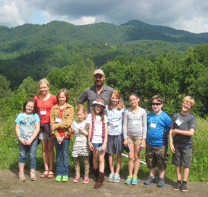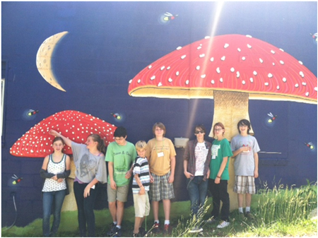 Thursday, the teens had a morning outing to the Bountiful Cities Project edible garden. They parked the van at Pack Square, and hiked through the park by the Asheville City Hall, down the steps and over a footbridge to a public garden full of small fruit. It was lovely! There were blueberries, elderberries, wineberries, apples, peaches, kiwi, strawberries, mulberries and more!